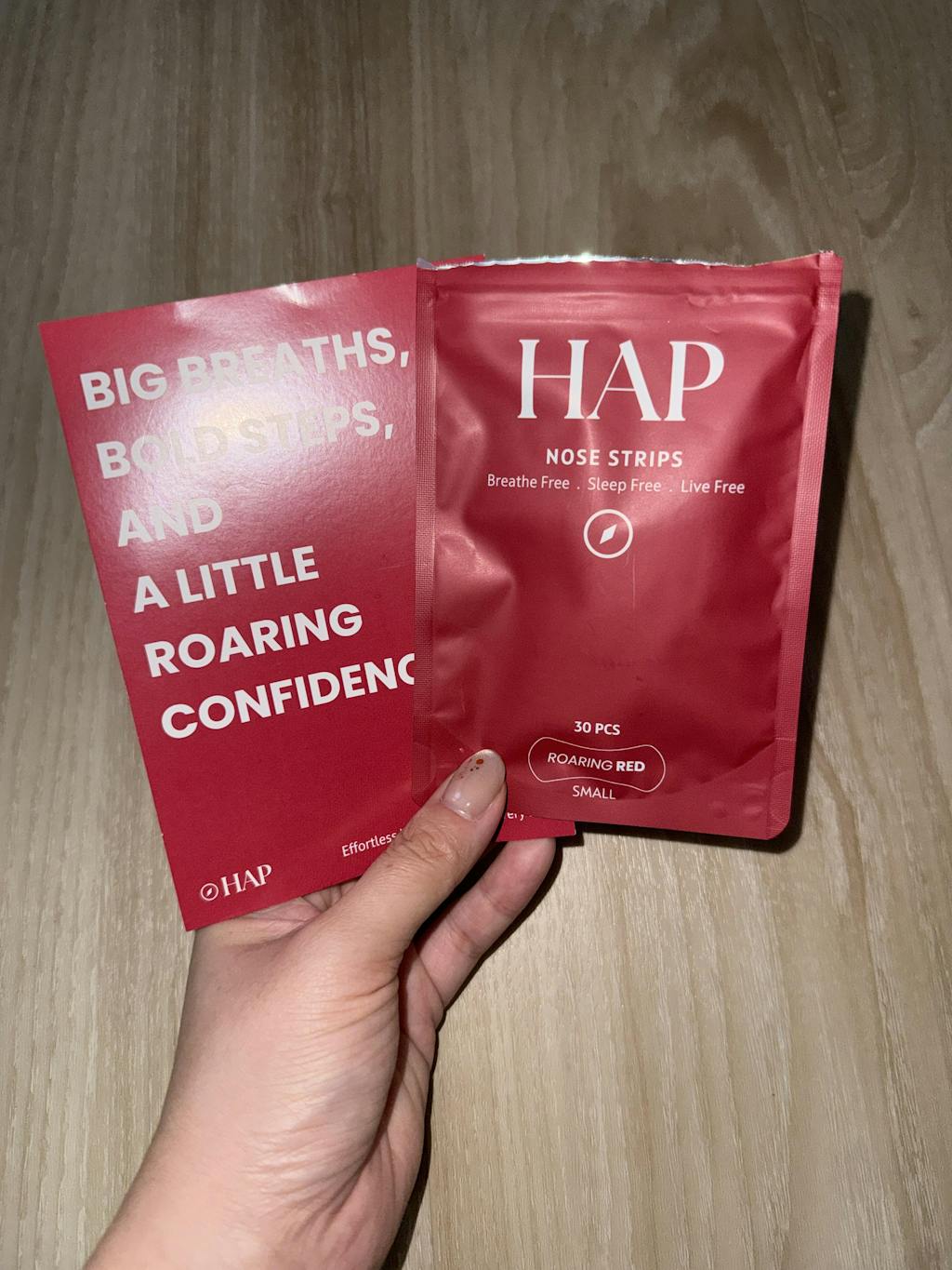 Apply HAP Kids Nose Strip on clean, dry skin; press ~5s to gently open nasal airway.